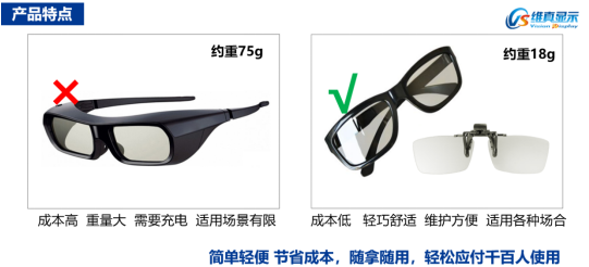2、采用主流的圓偏振眼鏡(也稱不閃式),無(wú)環(huán)境光影響,不閃爍,無(wú)需充電,輕薄,成本低。